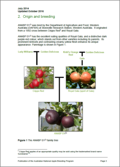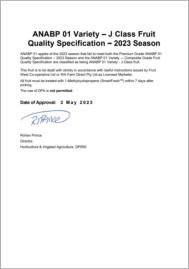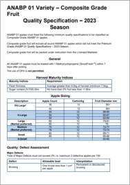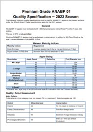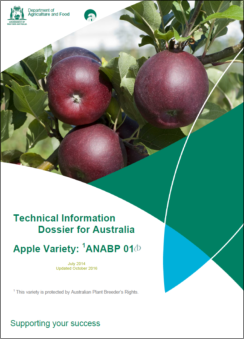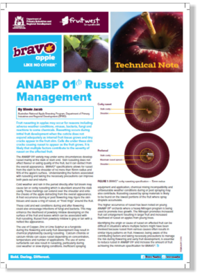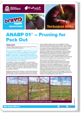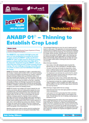 This good practice guide has been developed to provide apple growers with a concise summary of currently available production information relating to the ANABP 01 variety. Fruit of the ANABP 01 variety which meets the premium grade specification is marketed as the Bravo™ branded apple. Good practice in ANABP 01 production contributes to better packout and better returns.