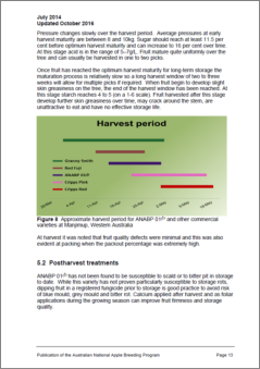ANABP 01 apple trees have medium vigour and a spreading growth habit with wide branch angles similar to its parent Cripps Red. The development of fruiting laterals is sufficient but not prolific and tree shape suggests that it would be suited to a range of rootstocks and tree training systems.ANABP 01 apples ripen towards the end of the apple harvest season - about 27 days after Golden Delicious and 14 days before apples from Cripps Pink. In Manjimup this is normally around mid-April but is dependent on seasonal conditions.ANABP 01 fruit that meets the trident Bravo™ apple quality specifications respond well to good temperature and storage management. Fruit should be pre-cooled to 2–4°C within 24 hours of harvest with the optimum storage temperature range of 0°C to 0.5°C.