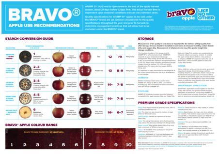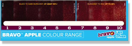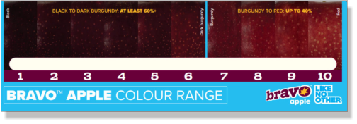 View the Bravo™ Apple Colour Chartproduced by Fruitwest.The Bravo™ apple must reach the colour 1 to 6 in order to be sold as a Bravo™. Please do not print, if you need a hard copy for your orchard or pack house please contact us (bravo@wafarmdirect.com.au).Want to know more? Contact us for more in depth information for growers.